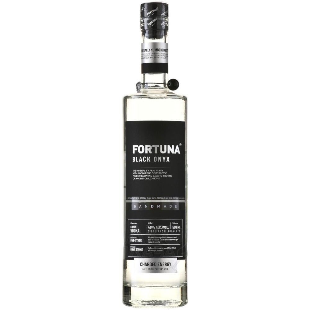 "Fortuna" Black Onyx — уникальная водка, которая гармонично сочетает современные технологии производства и таинственную силу черного оникса. Водка проходит дополнительную фильтрациу через песочный фильтр, заполненный природным ониксом. Легкую кислинку во вкусе обеспечивает настой груши сорта "Конференс". К каждой бутылке водки "Fortuna" Onyx привязан натуральный оникс, который можно носить в качестве талисмана.