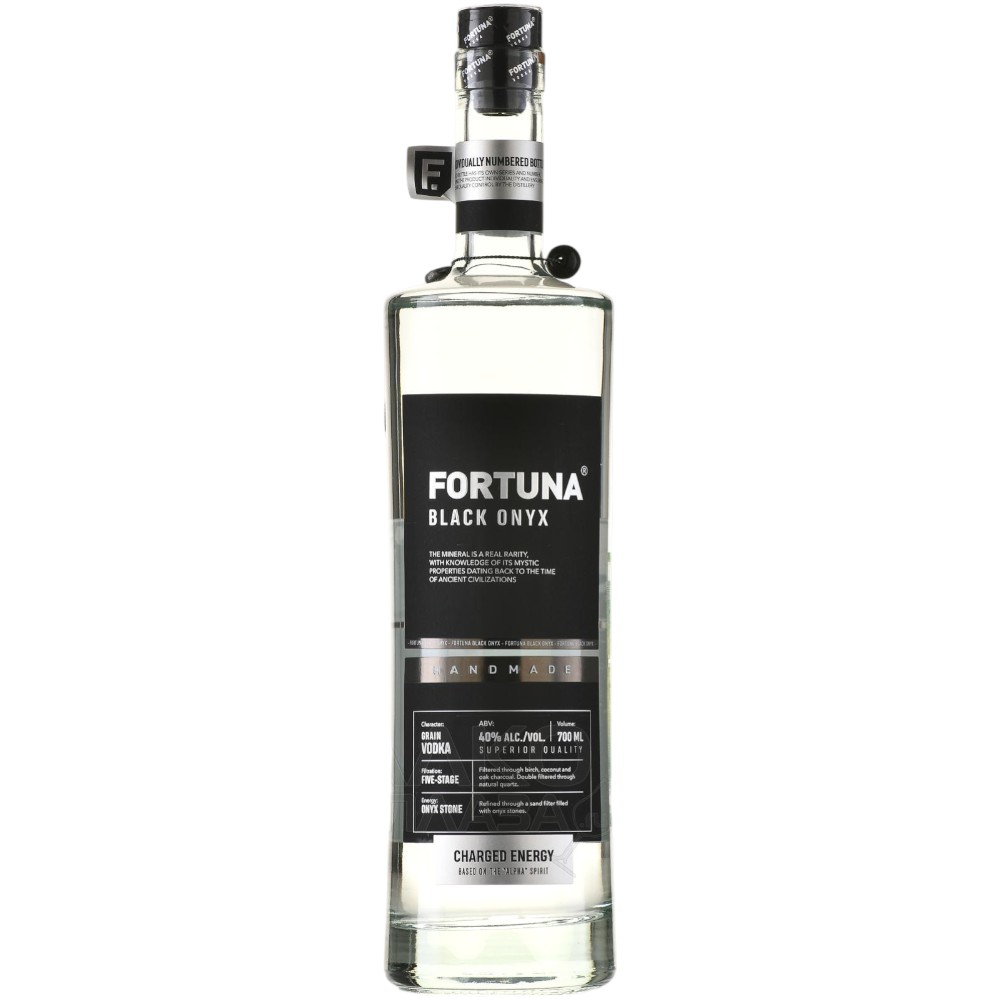 "Fortuna" Black Onyx — уникальная водка, которая гармонично сочетает современные технологии производства и таинственную силу черного оникса. Водка проходит дополнительную фильтрациу через песочный фильтр, заполненный природным ониксом. Легкую кислинку во вкусе обеспечивает настой груши сорта "Конференс". К каждой бутылке водки "Fortuna" Onyx привязан натуральный оникс, который можно носить в качестве талисмана.