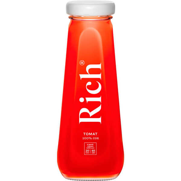 Откройте для себя пикантный сок, сделанный из отборных португальских томатов. Насыщенный, благородный вкус с изысканным, чуть пряным ароматом.Строгий отбор сочных и свежих фруктов, постоянный контроль производства и готовой продукции – составляющие безупречного качества соков и нектаров “Rich”.Но что действительно отличает продукцию под маркой “Rich” – это изысканный, многогранный вкус. Который рожден благодаря сочетанию разных сортов одного фрукта в соках и нектарах.