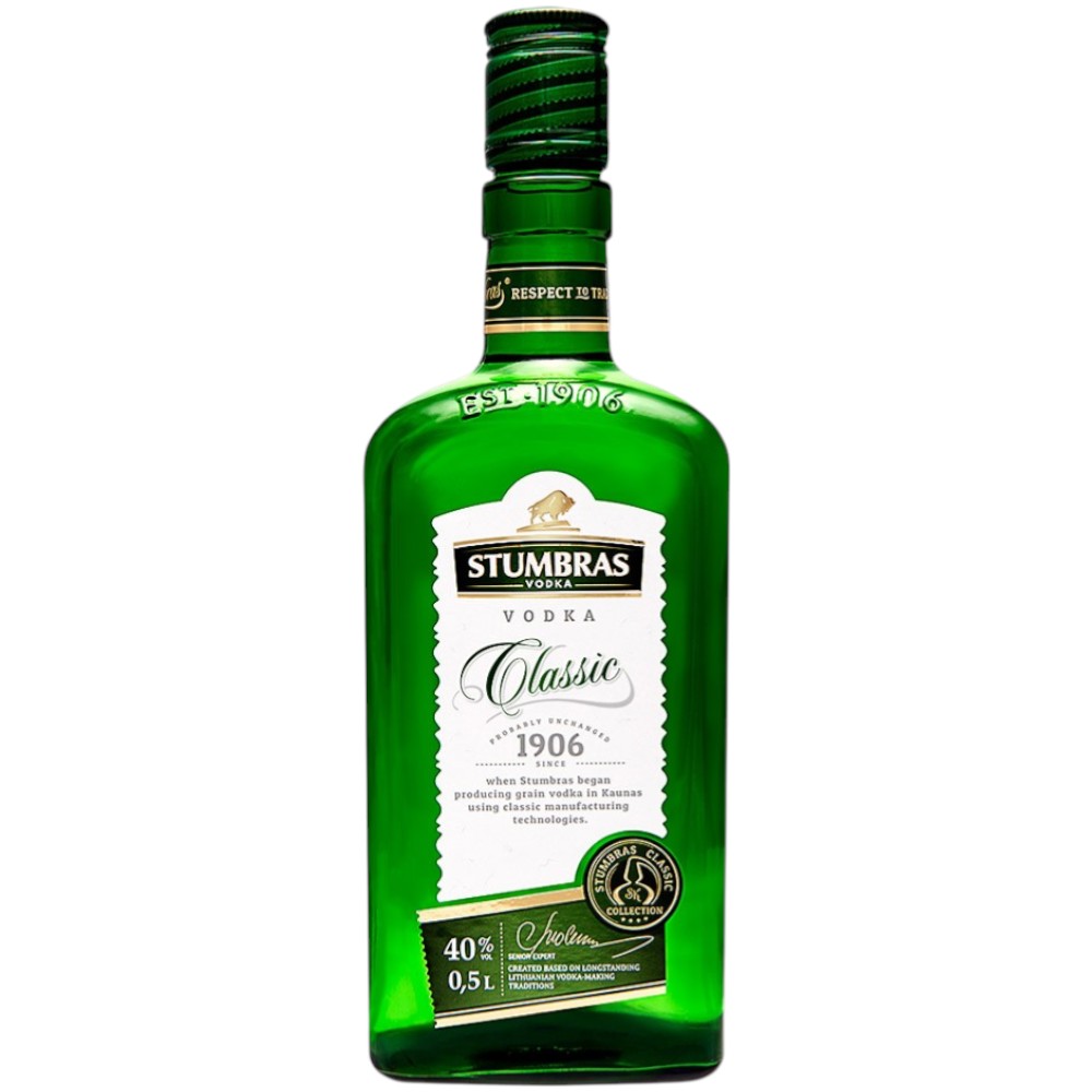 Водка Stumbras Vodka Classic — классическая водка, произведённая одним из старейших брендов Балтийского региона, сочетающая традиции качества и мягкий, сбалансированный вкус. Напиток создаётся на основе отборного зернового спирта и кристально чистой воды, а многоступенчатая дистилляция и фильтрация обеспечивают гармоничность вкуса, чистоту и гладкую текстуру. Бренд Stumbras известен стабильным качеством продукции и поддержкой классических водочных традиций.