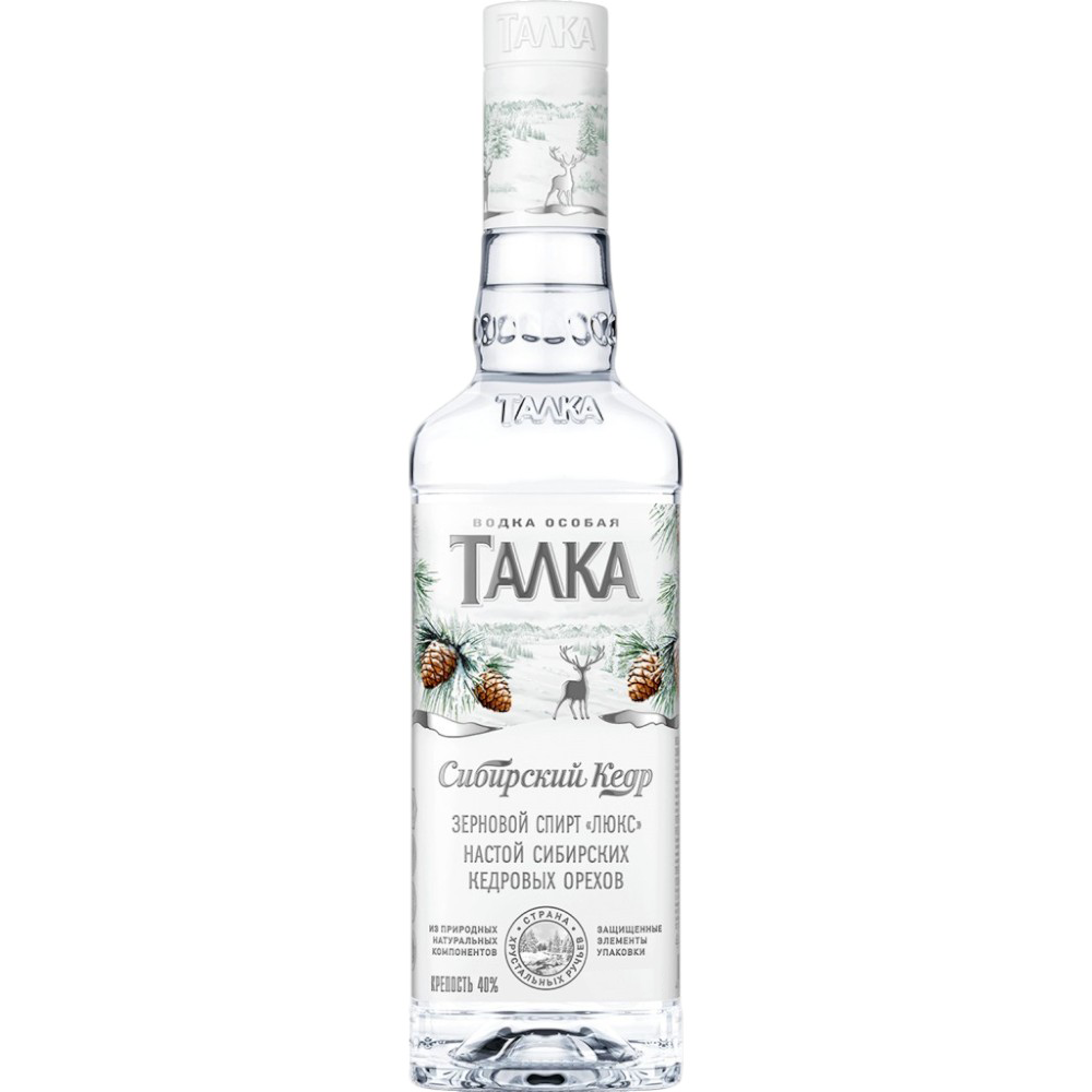 "Талка" Сибирский Кедр — новинка от уже полюбившегося бренда "Талка", представляющего продукцию Сибирского ликероводочного завода. При создании водки использовались исключительно природные компоненты. В ее основе — зерновой спирт класса "Люкс". А отличительной чертой водки "Талка" является то, что она изготавливается из талой ледниковой воды, символизирующей рожденную самой сибирской природой чистоту. Для получения нового вкуса в водку добавили настой кедровых орехов. Такой ингредиент был выбран неслучайно — ведь именно сибирский кедр считается главным деревом таежной Сибири. А кедровые орехи издавна ценятся за свои целебные свойства и богатый макро- и микроэлементами, белками и углеводами состав.