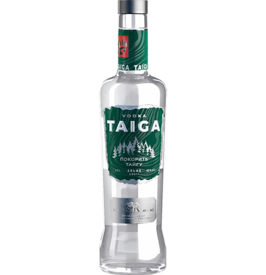"Taiga" — качественная водка, в производстве которой используется специально подготовленная питьевая вода, спирт класса "Альфа", настой солода ячменного, фруктоза, лактоза. Дизайн бутылки весьма презентабелен. Для удобного потребления водки, бутылка снабжена качественным бесклапанным дозатором-рассекателем.
