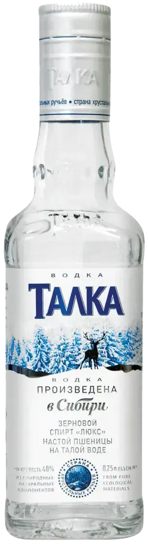 Водка "Талка" — настоящая сибирская водка, дышащая кристальной чистотой. Для ее производства используют только отборную пшеницу, настоянную на чистейшей ледниковой талой воде. Водка изготавливается из зернового спирта класса "Люкс" по запатентованной технологии смешивания воды и спирта и проходит фильтрацию серебром. "Талка" создана под стать красоте сибирской природы — чистая, строгая, настоящая.